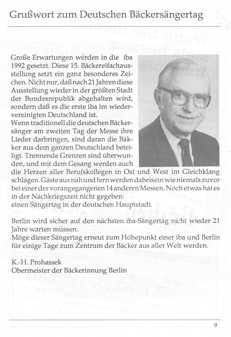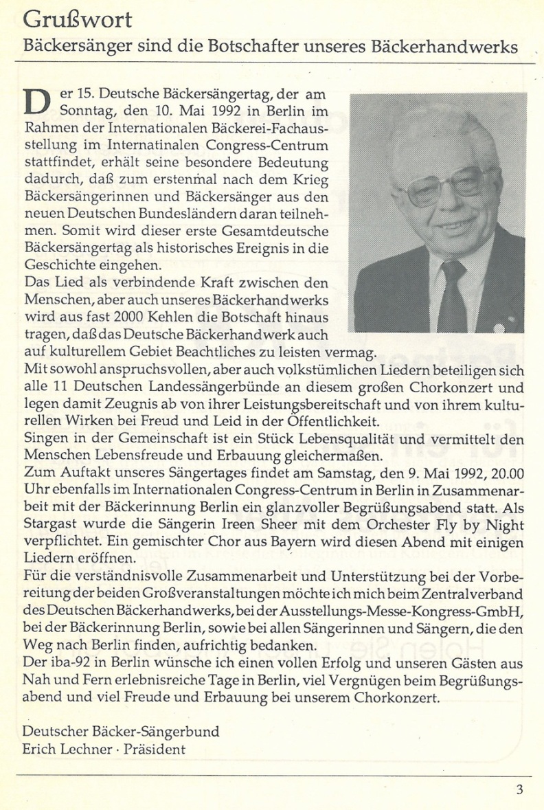 Der 15. Deutsche Bäckersängertag 1992 in Berlin stellte ein außerordentliches Ereignis dar. Erstmals nach dem 2. Weltkrieg konnten sich wieder alle Bäckersänger aus dem gesamten Bundesgebiet treffen.